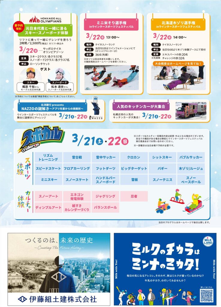 ・雪解けが進みスキーやスノーボードでの安全な滑走が難しいとサッポロテイネスキー場が判断した場合、今シーズン(2025-2026シーズン)に於けるオリンピアゾーンの営業終了予定日(3月29日)および ハイランドゾーンの営業終了予定日(5月6日)を短縮することがあります。