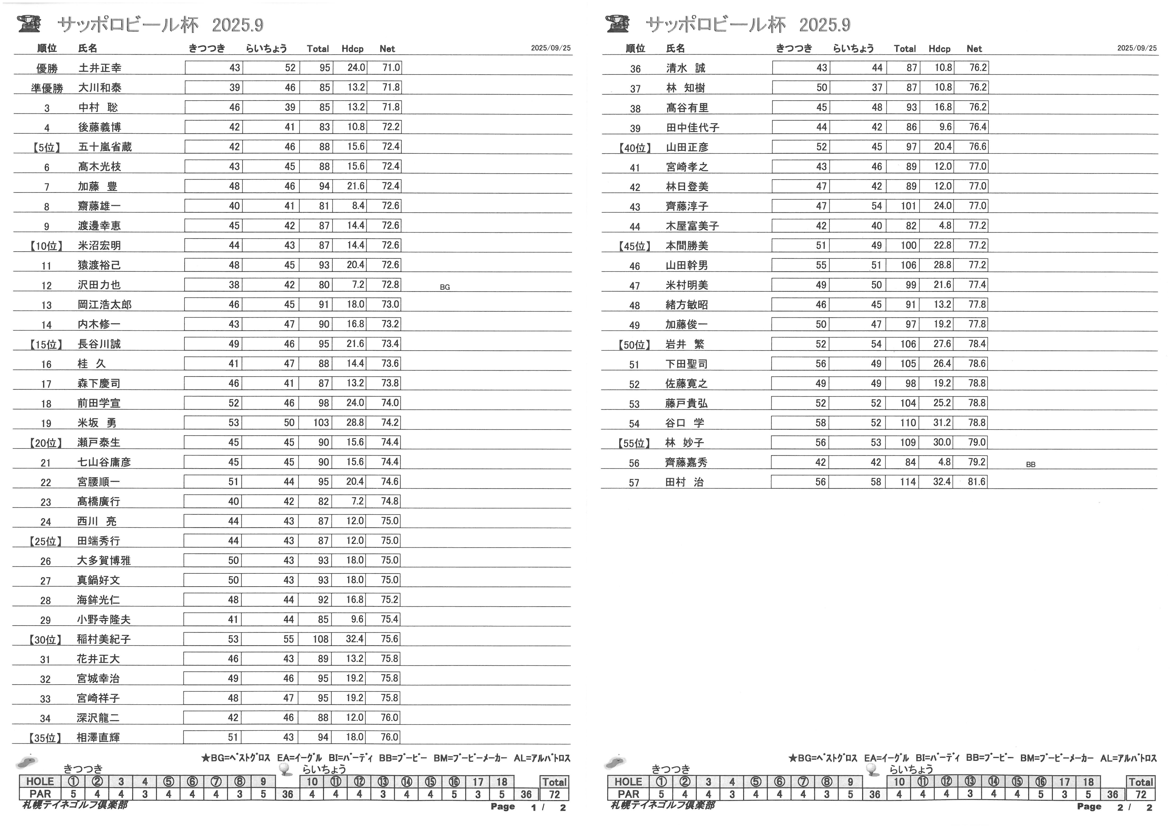 2025.09.25 Thu Tweet 9月25日 サッポロビール杯 成績 本日は、朝の悪天候の中57名の参加をいただき誠にありがとうございました 本日の優勝者は、土井 正幸 様 でした。 おめでとうございます。