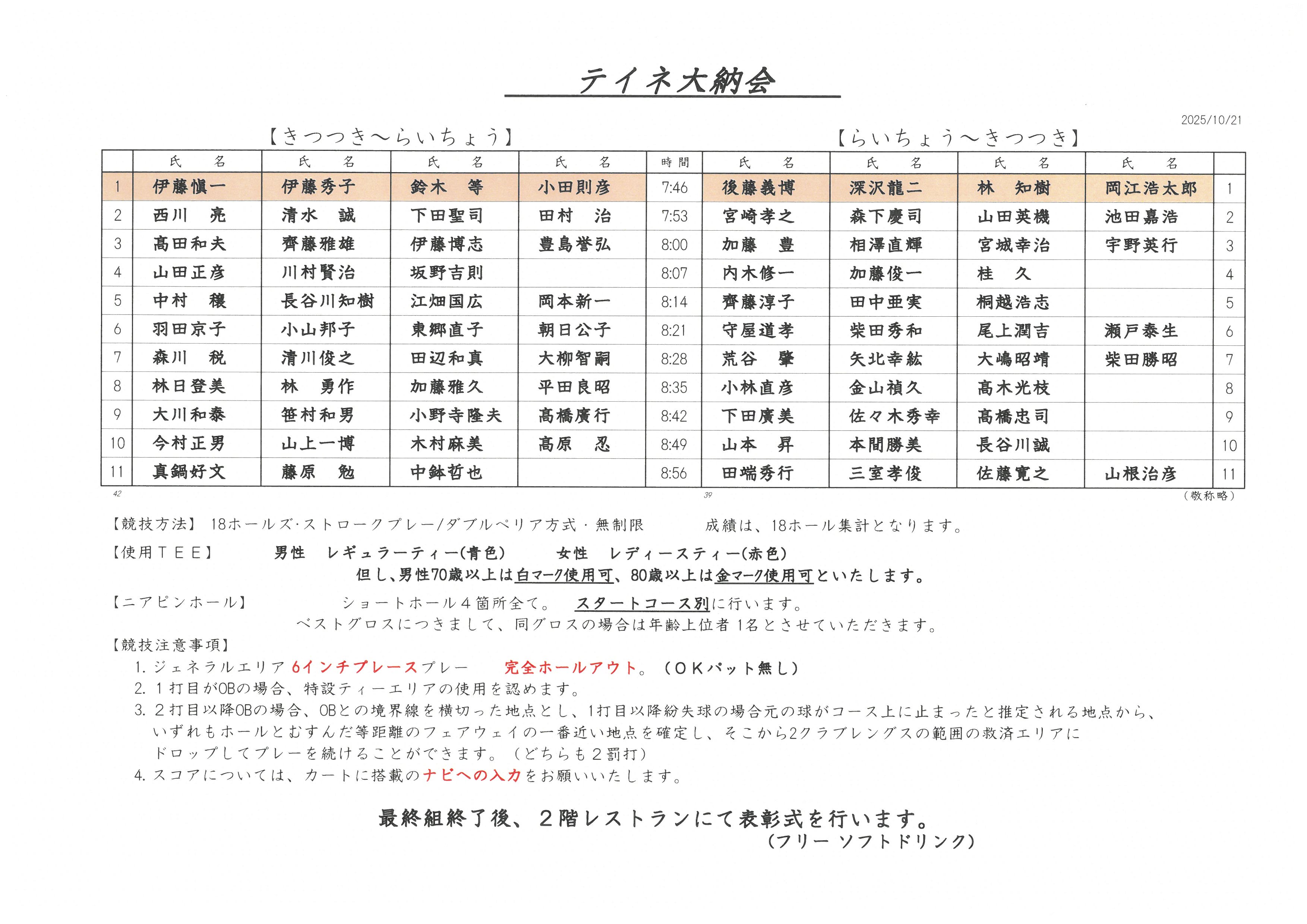 2025.10.20 Mon Tweet テイネ大納会 スタート組合せ テイネ大納会のスタート時間は下記の通りでございます。 尚、参加者に欠員等が発生した際は、 組み合せ及びスタート時間を変更する場合もございますので予めご了承ください。