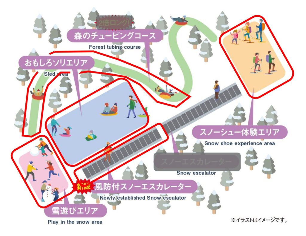 ※「森のチュービングコース」の他に、「おもしろソリエリア」「雪遊びエリア」「スノーシュー体験エリア」もオープンいたしております。